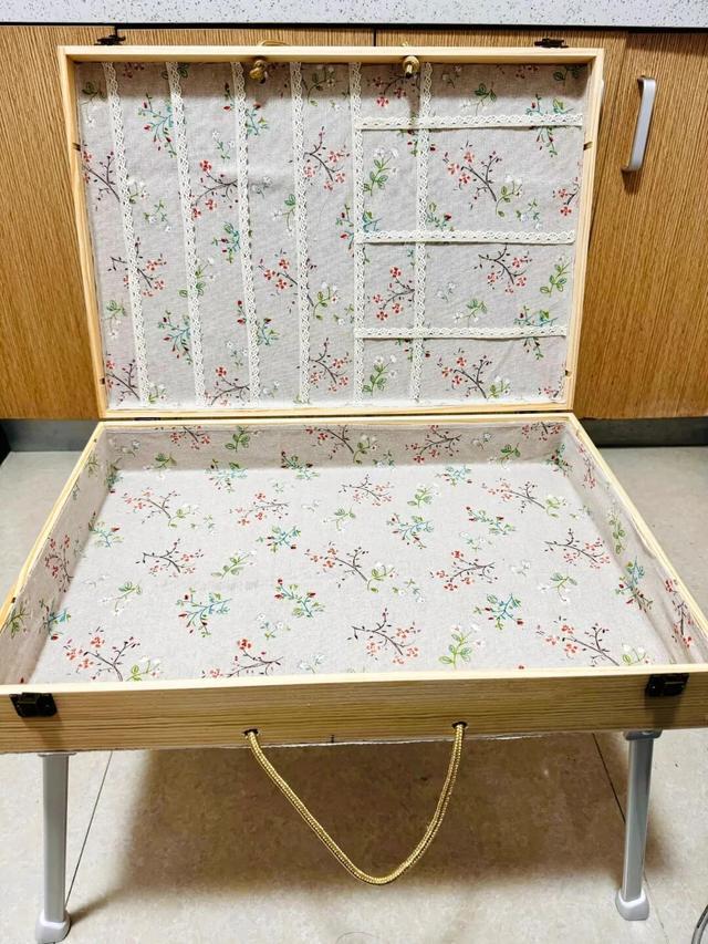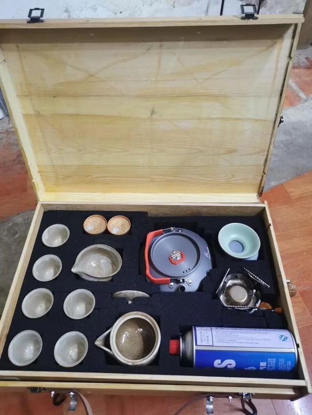 网购4支可折叠桌腿装到箱子上,内部垫一块海绵好收纳茶具,再找个不要的皮带剪个把手即可。