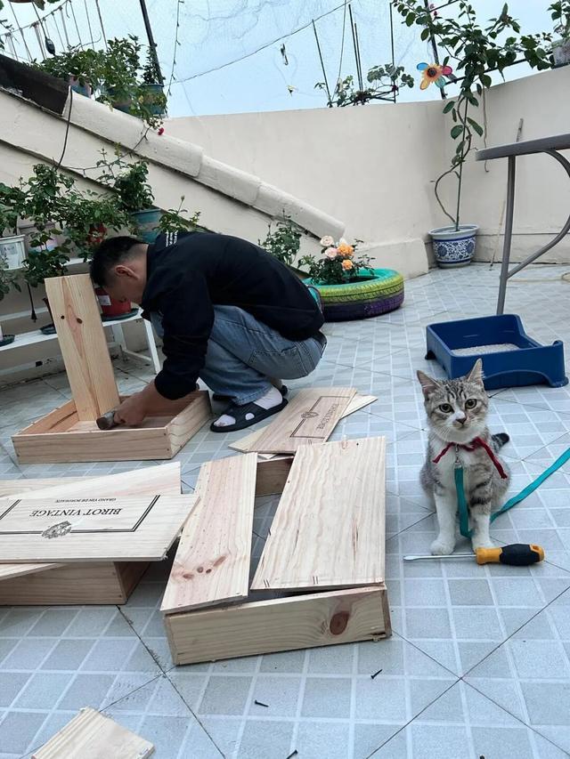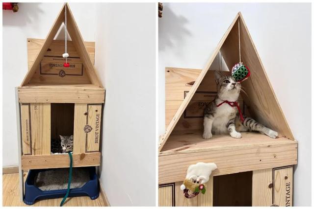 像「网友@劳哥」家的猫窝,就增加了一个小房顶设计,再挂上一个玩具,立马就成了猫猫的“豪华别墅”。