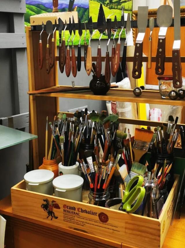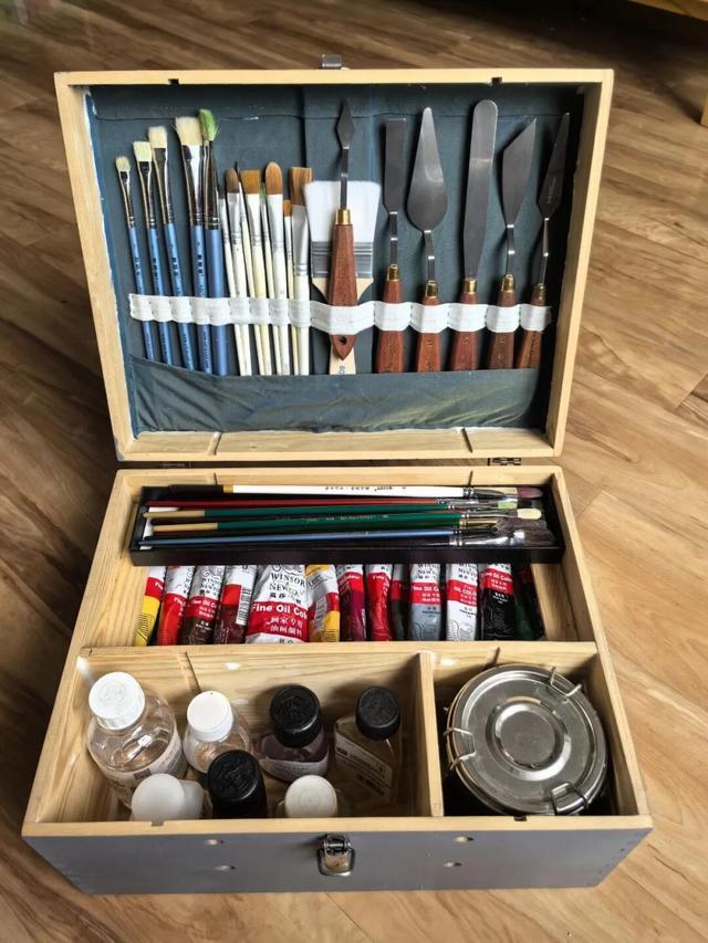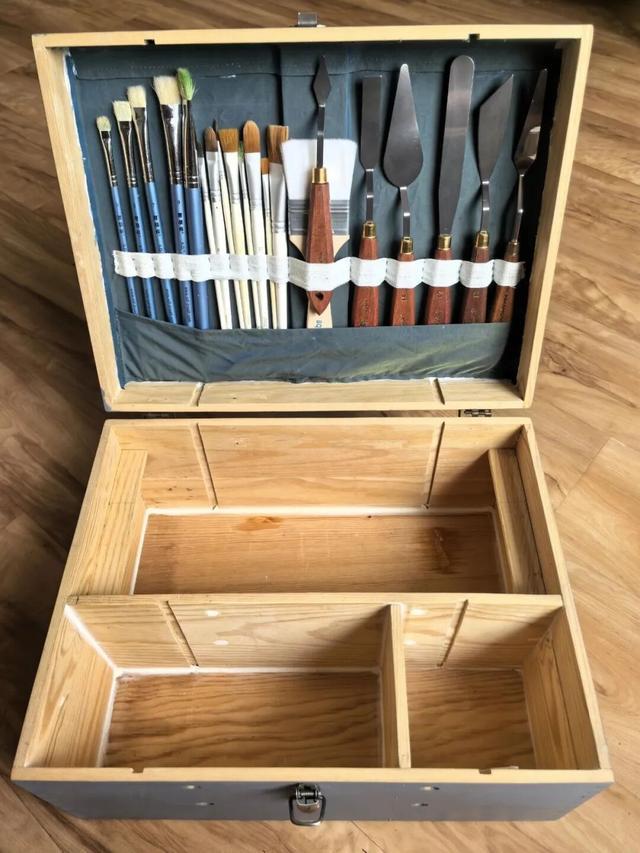 内部用红酒盒子拆下来的木板做个分隔架,翻盖内部用旧布料和松紧绳做个工具收纳架,一个美术工具箱就有了。
