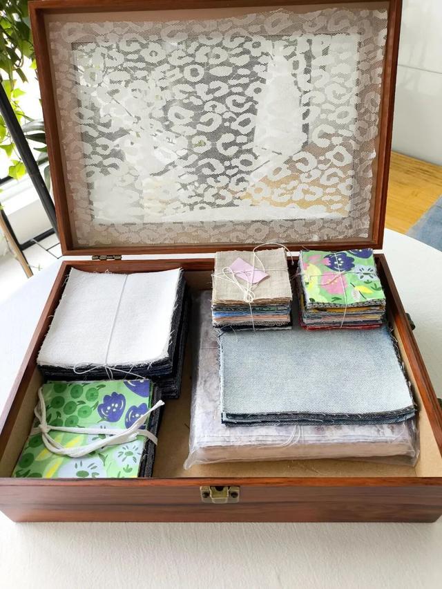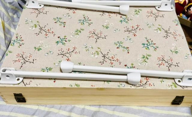 像「网友@梧桐雨」同样捡了一个红酒盒回来,拿回来擦干净后,拆掉内部的红酒纸格,再粘上一块纱,专门用来收纳拼布。