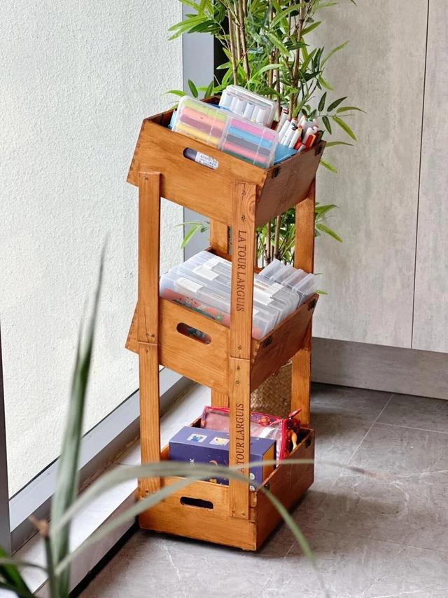 如果想让置物架更加精致一些,还可以参考「网友@草莓小姐」的方法,给红酒盒刷上木蜡油,使其看起来更有质感一些。